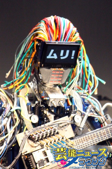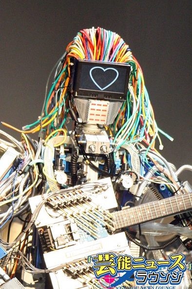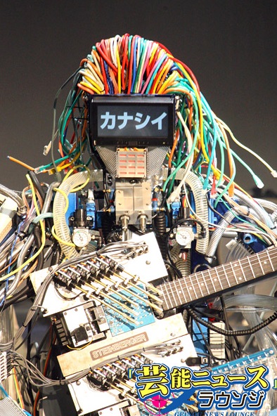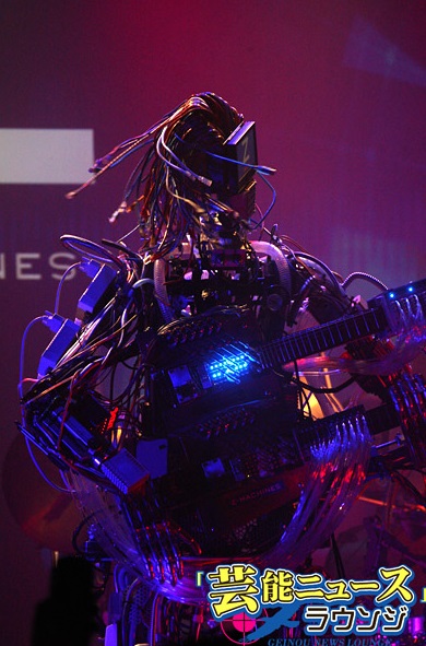 ギターロボットの「MACH(マッハ)」は、弦を押さえる78本の指と、12個のギターピックを装備し、色とりどりのLANケーブルで作られた髪も揺れる。人間には不可能な速弾きのギタリストでもある。顔の部分がモニターになっていて、ロボット特有の電子音声とともに、文字も表示されるなど愛嬌満点。