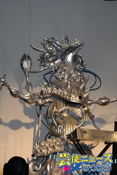 ドラムロボットの「ASHURA(アシュラ)」は、6本の腕と21本のドラムスティックで、背中の方にまであるドラムセットを操るなど、人間には不可能な演奏を実現。